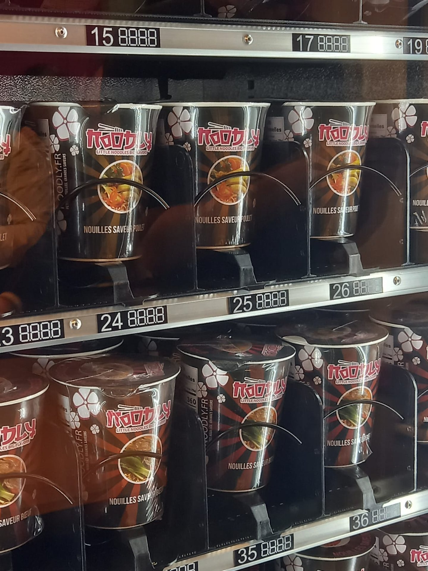 Dans un distributeur automatique de nouilles, on retrouve généralement plusieurs recettes inspirées de la cuisine asiatique : poulet, bœuf, légumes ou épices.